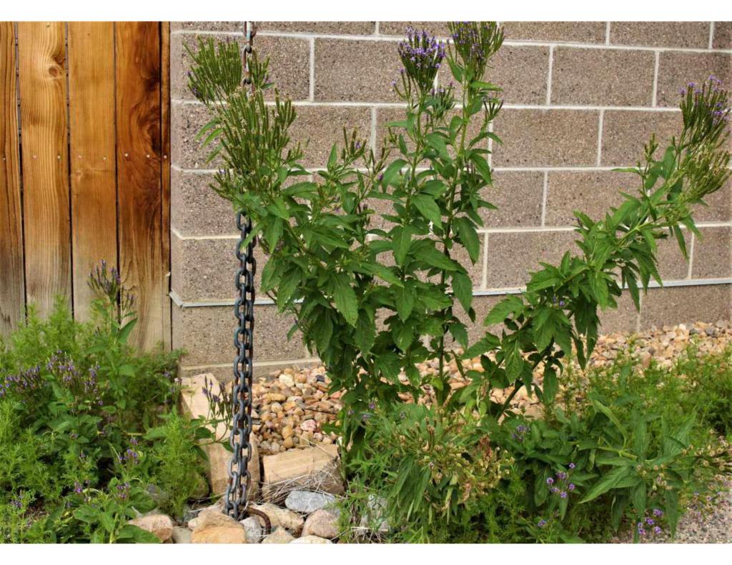 So, we have wetland plants that are wetland plants in a landscape that is never watered; the blue vervain, it’s a wetland plant that we planted where our downspouts are, and all that water from the roof is concentrated there. So even the tiniest yard has that kind of different hydrological zones and thinking about where to put plants. In front of our building, we have a bioswale, so it takes all of the water that comes off of our parking lot, and it flows through a series of little pools. It’s not enough that we would have an abortive loss or anything. It’s like within 24 hours, all that water would disappear after a rain storm, but it just slows the water down a little bit and allows it to percolate into the ground, and people always comment about how beautiful the landscaping is in front of our building, and yet we never water that because in the high and dry areas, there are native plants that don’t like any water and in the bottom of it are things like the milkweeds and the tall grass species and golden rods that like a little bit more moisture and the plants seem to find the right zone for themselves and that’s a great example of how we can have these rain nourished gardens and like it’s called passive rainwater harvesting so just slowing down the water a little bit and letting that percolate the ground and nourish our landscapes.